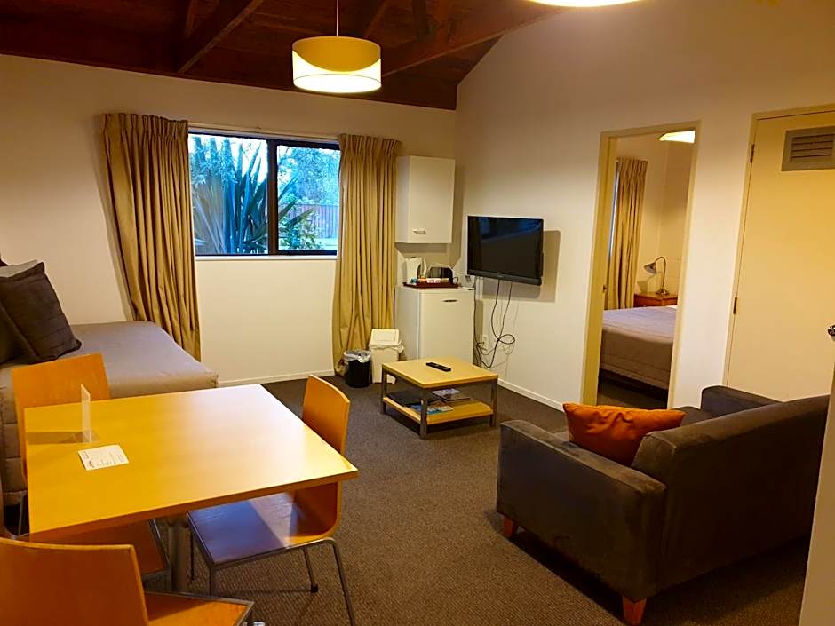 This two-bedroom apartment has a full kitchen, a lounge area with a flat-screen satellite TV, and electric blankets.